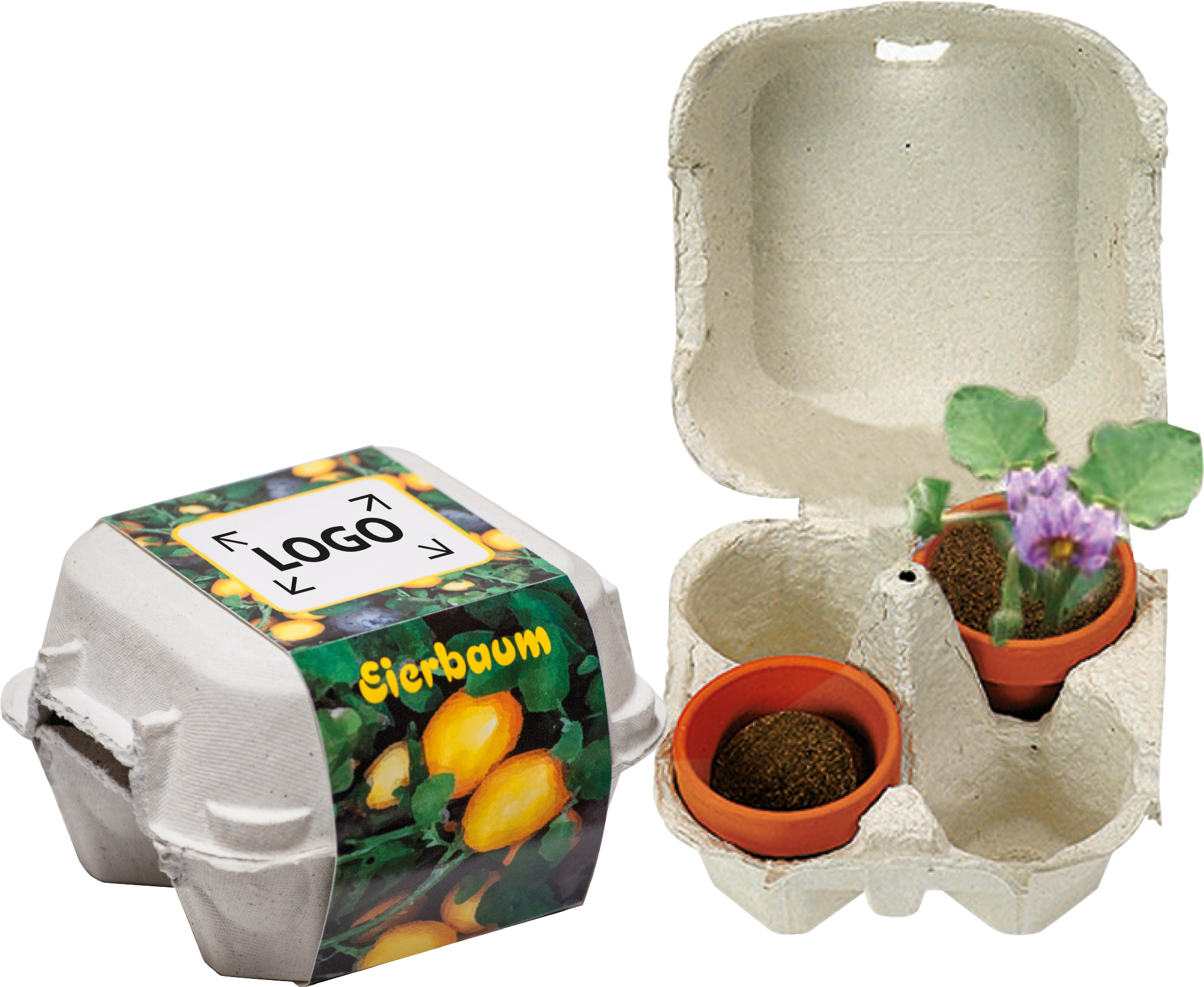 Kleines Tontöpfchen mit Erdtablette und Eierbaumsamen. Der Eierbaum ist eine Topfpflanze und bildet nach der Blüte kleine eiförmige Früchte. Diese gehören zu der Gattung der Aubergine. Ein Werbeaufdruck im Standardmotiv oder eine eigene Gestaltung der Banderole ist ab 250 Stück möglich.